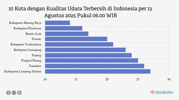 Berikut ini daftar 10 kota dengan kualitas udara paling bersih di Indonesia menurut KLHK pada Rabu, 13 Agustus 2025 pukul 06.00 WIB.