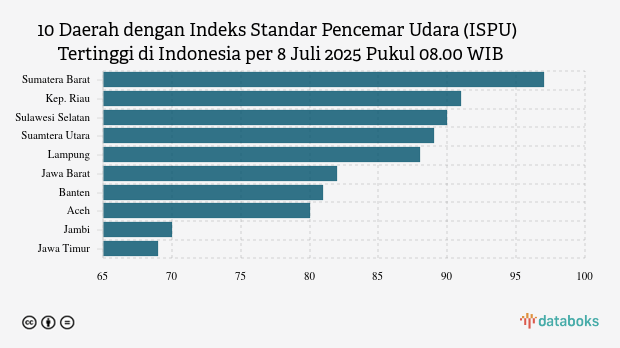 Berikut daftar 10 provinsi dengan indeks kualitas udara terburuk di Indonesia pada Selasa, 8 Juli 2025 pukul 08.00 WIB.