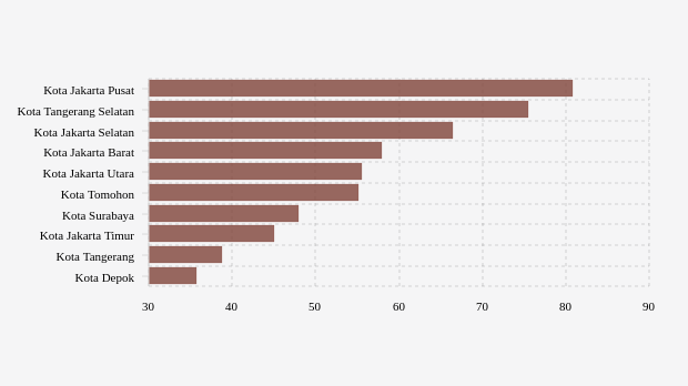 Konfirmasi positif lima kabupaten/kota teratas dengan angka lebih dari 55,45 jiwa per 100 ribu penduduk/minggu, yaitu kota Jakarta Pusat, kota Tangerang Selatan, kota Jakarta Selatan, kota Jakarta Barat dan kota Jakarta Utara dengan masing-masing nilai 80,77 jiwa per 100 ribu penduduk/minggu, 75,49 jiwa per 100 ribu penduduk/minggu, 66,51 jiwa per 100 ribu penduduk/minggu, 58,03 jiwa per 100 ribu penduduk/minggu dan 55,45 jiwa per 100 ribu penduduk/minggu.