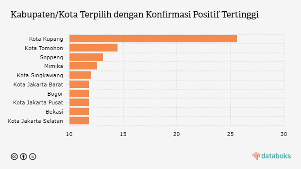 Konfirmasi positif lima kabupaten/kota teratas dengan angka lebih dari 12,03 jiwa per 100 ribu penduduk/minggu, yaitu kota Kupang, kota Tomohon, Soppeng, Mimika dan kota Singkawang dengan masing-masing nilai 25,55 jiwa per 100 ribu penduduk/minggu, 14,49 jiwa per 100 ribu penduduk/minggu, 13,05 jiwa per 100 ribu penduduk/minggu, 12,62 jiwa per 100 ribu penduduk/minggu dan 12,03 jiwa per 100 ribu penduduk/minggu.