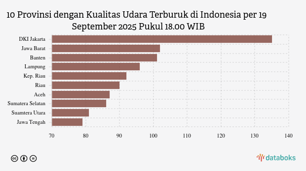 Berikut daftar 10 provinsi dengan indeks kualitas udara terburuk di Indonesia pada Jumat, 19 September 2025 pukul 18.00 WIB.