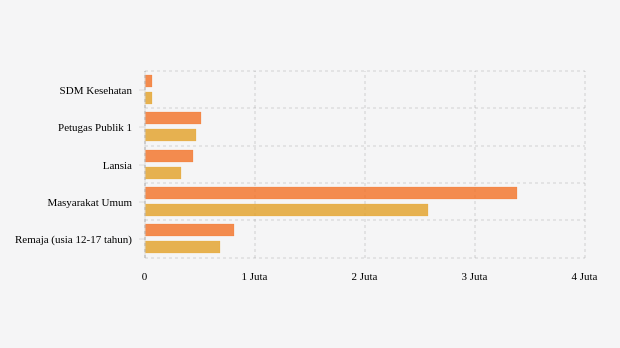 Vaksinasi ke petugas publik dengan target 439,48 ribu jiwa. Vaksinasi dosis 1 dilaporkan telah mencapai 506,43 ribu jiwa (115,23 persen target) dan dosis 2 dengan capaian 106,2 persen atau berhasil tersalurkan sebanyak 466,72 ribu jiwa.