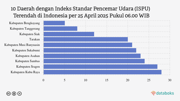 Kualitas udara Kabupaten Bengkayang pagi ini paling bersih di Indonesia. Berdasarkan indeks kualitas udara versi Kementerian Lingkungan Hidup dan Kehutanan (KLHK), Kabupaten Bengkayang memiliki skor 5 pada Jumat (25/4/2025) pukul 06.00 WIB.