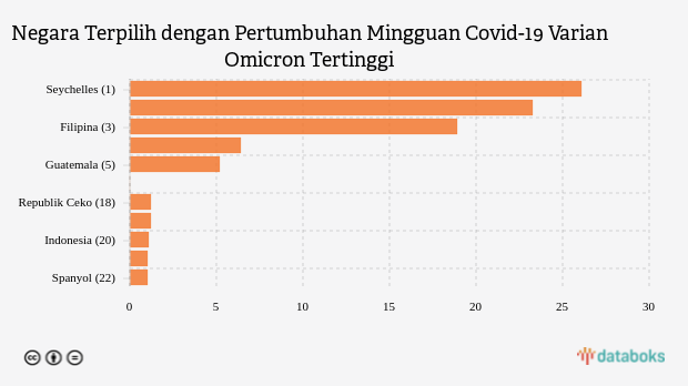 Berikutnya, penambahan kasus Omicron di Filipina naik 18,89 persen menjadi 10.720 kasus dibandingkan pekan sebelumnya, penambahan kasus Omicron di Peru naik 6,38 persen menjadi 19.772 kasus dibandingkan pekan sebelumnya dan Guatemala dengan penambahan kasus Omicron 1.189 kasus (naik 5,22%)