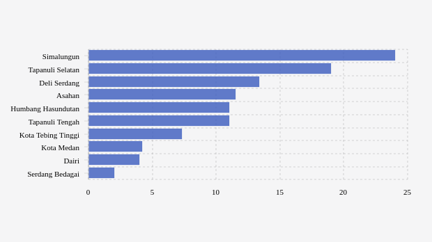 Simalungun adalah kabupaten di urutan pertama dengan tracing mingguan tertinggi sebesar 24 persen. Kondisi tracing mingguan di kabupaten ini memperlihatkan ada kemajuan dengan adanya penurunan dibandingkan pekan sebelumnya yang tercatat 25 persen.