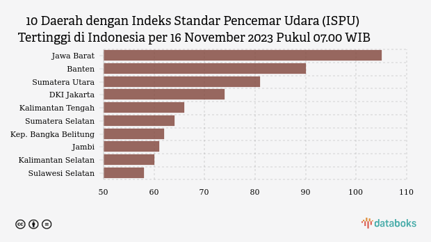 Berikut daftar 10 provinsi dengan indeks kualitas udara terburuk di Indonesia pada Kamis, 16 November 2023 pukul 07.00 WIB.