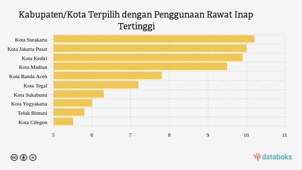 Penggunaan rawat inap lima kabupaten/kota teratas dengan angka lebih dari 7,85 pasien per 100 ribu penduduk/minggu, yaitu kota Surakarta, kota Jakarta Pusat, kota Kediri, kota Madiun dan kota Banda Aceh dengan masing-masing nilai 10,2 pasien per 100 ribu penduduk/minggu, 9,96 pasien per 100 ribu penduduk/minggu, 9,9 pasien per 100 ribu penduduk/minggu, 9,53 pasien per 100 ribu penduduk/minggu dan 7,85 pasien per 100 ribu penduduk/minggu.