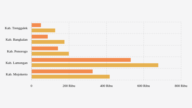 Kabupaten Trenggalek di Jawa Timur, telah menggunakan vaksin sebanyak 125,28 ribu dosis vaksin per Sabtu, 25 September 2021. Jumlah ini tumbuh 155.58 persen dibandingkan penggunaan vaksin minggu kemarin yang baru di angka 49.020.