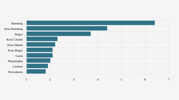 Bandung adalah kabupaten di urutan pertama dengan BOR tertinggi sebesar 6,4 persen. Kondisi BOR di kabupaten ini memperlihatkan ada kemajuan dengan adanya penurunan dibandingkan pekan sebelumnya yang tercatat 7,21 persen.