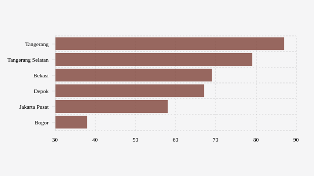 Di bawah kota Tangerang, ada Tangerang Selatan di urutan kedua dengan indeks kualitas udara 79. Selanjutnya, Bekasi menempati urutan ketiga dengan skor 69.