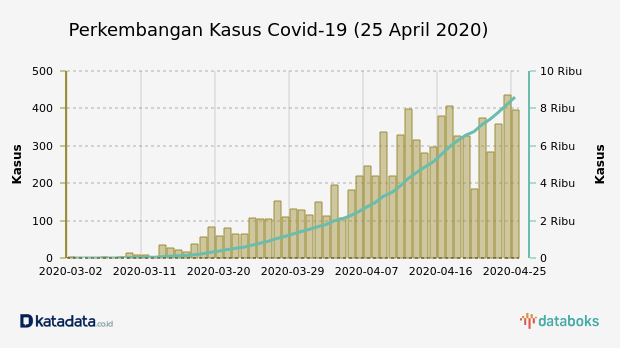 Kasus positif terinfeksi virus corona (Covid-19) mencapai 8.607 orang hingga 25 April 2020. Kasus ini bertambah 396 orang dari hari sebelumnya. Dari jumlah kasus tersebut, terdapat 720 orang meninggal dan 1.042 pasien dinyatakan sembuh.