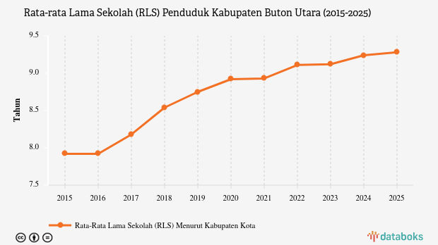 Rata-rata lama sekolah (RLS) penduduk berusia 25 tahun ke atas di Buton Utara, Sulawesi Tenggara sebesar 9,28 tahun pada 2025.
