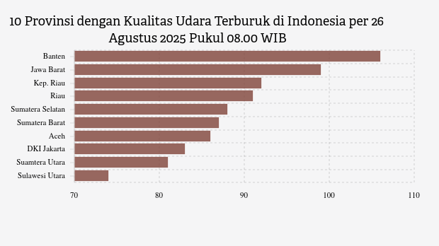 Berikut daftar 10 provinsi dengan indeks kualitas udara terburuk di Indonesia pada Selasa, 26 Agustus 2025 pukul 08.00 WIB.