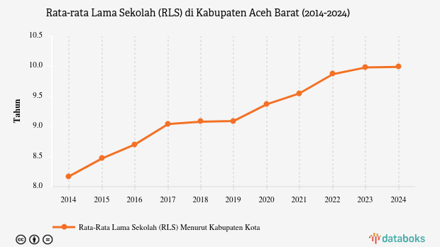 Rata-rata lama sekolah (RLS) penduduk berusia 25 tahun ke atas di Aceh Barat, Aceh sebesar 9,99 tahun pada 2024.