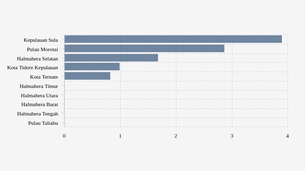 Masih di urutan lima besar selain dua wilayah di atas adalah Halmahera Selatan, kota Tidore Kepulauan dan kota Ternate. Masing-masing mencatatkan jumlah konfirmasi mingguan sebanyak 1,68 kasus, 0,98 kasus dan 0,82 kasus.