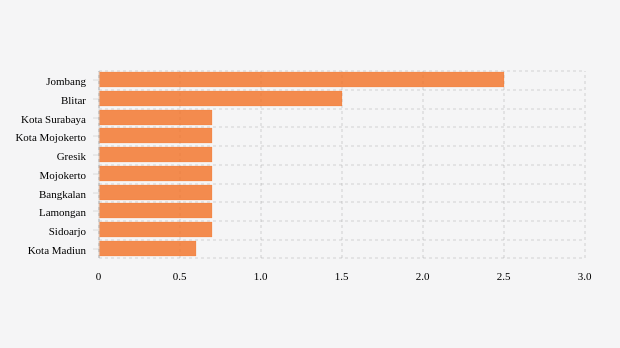 Kondisi yang sama terjadi di Blitar yang mencatatkan jumlah konfirmasi aglomerasi positif covid-19 mingguan sebesar 1,53 jiwa per 100 ribu penduduk/minggu. Di kabupaten ini, jumlah konfirmasi aglomerasi positif covid-19 mingguan juga terlihat lebih tinggi dibandingkan pekan sebelumnya yang baru 1,28 jiwa per 100 ribu penduduk/minggu. Di urutan berikutnya kota Surabaya. Kabupaten di provinsi Jawa Timur ini mencatatkan jumlah konfirmasi aglomerasi positif covid-19 mingguan sebesar 0,7 jiwa per 100 ribu penduduk/minggu