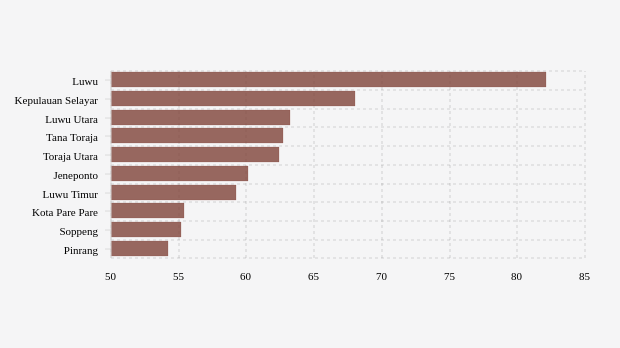 Luwu adalah kabupaten di urutan pertama dengan cakupan vaksinasi lansia tertinggi sebesar 82,08 persen. Kondisi cakupan vaksinasi lansia di kabupaten ini terlihat menurun dibandingkan pekan sebelumnya yang tercatat 82,1 persen.