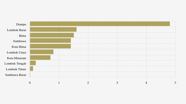 Kondisi yang sama terjadi di Lombok Barat yang mencatatkan positivity rate tujuh hari terakhir sebesar 1,62 persen. Di kabupaten ini, positivity rate tujuh hari terakhir juga terlihat lebih tinggi dibandingkan pekan sebelumnya yang baru 0,4 persen. Di urutan berikutnya Bima. Kabupaten di provinsi NTB ini mencatatkan positivity rate tujuh hari terakhir sebesar 1,46 persen