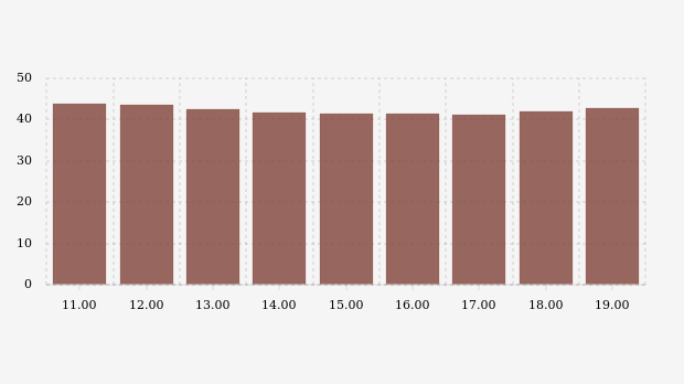 Konsentrasi PM2.5 udara Jakarta terendah berada di level 41,2 µg/m³ pada pukul 17.00 WIB, sedangkan konsentrasi PM2.5 tertinggi pada pukul 11.00 WIB dengan nilai 43,8 µg/m³.