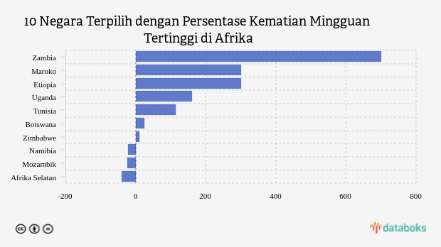 Zambia berada di urutan pertama dengan penambahan kematian per minggu tumbuh 700 persen. Di negara ini, Worldmeter mencatat jumlah kematian sebanyak delapan jiwa, bertambah dibandingkan pekan sebelumnya yang dilaporkan hanya satu jiwa.