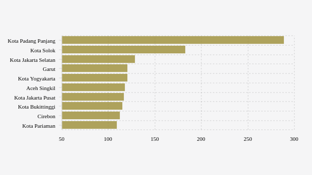 Vaksinasi lansia lima kabupaten/kota teratas dengan angka lebih dari 120,14 persen, yaitu kota Padang Panjang, kota Solok, kota Jakarta Selatan, Garut dan kota Yogyakarta dengan masing-masing nilai 288,42 persen, 182,36 persen, 128,46 persen, 120,32 persen dan 120,14 persen.