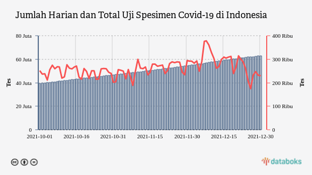 Tes Covid-19 di Indonesia pada Kamis, 30 Desember 2021 sebanyak 229,76 ribu spesimen. Jumlah ini lebih rendah dibandingkan spesimen yang diuji pada hari sebelumya. Hingga hari ini, total spesimen yang telah diperiksa sebanyak 62,96 juta.