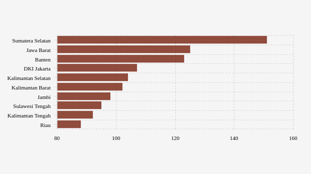 Di bawah Sumatera Selatan, ada Jawa Barat yang menempati posisi kedua terburuk di Indonesia dengan indeks kualitas udara 125. Kemudian, di posisi ketiga ada Banten dengan indeks kualitas udara 123.