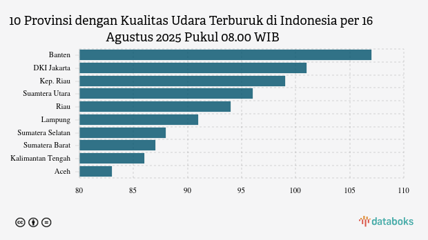 Berikut daftar 10 provinsi dengan indeks kualitas udara terburuk di Indonesia pada Sabtu, 16 Agustus 2025 pukul 08.00 WIB.