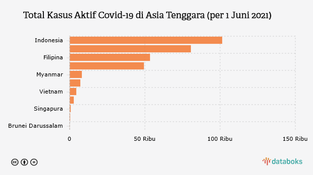 Indonesia memiliki 101.325 kasus aktif Covid-19 hingga Selasa, 1 Juni 2021. Jumlah kasus aktif corona tersebut tercatat paling besar di Asia Tenggara, mengalahkan Malaysia dan Filipina yang masing-masing mencapai 80.474 kasus dan 53.203 kasus.