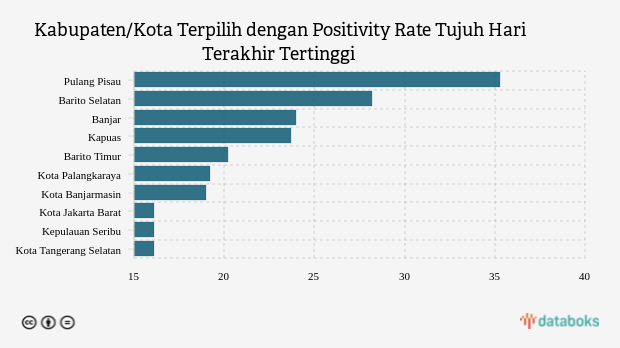 positivity rate tujuh hari terakhir lima kabupaten/kota teratas dengan angka lebih dari 20,24 persen, yaitu Pulang Pisau, Barito Selatan, Banjar, Kapuas dan Barito Timur dengan masing-masing nilai 35,29 persen, 28,17 persen, 23,96 persen, 23,68 persen dan 20,24 persen.