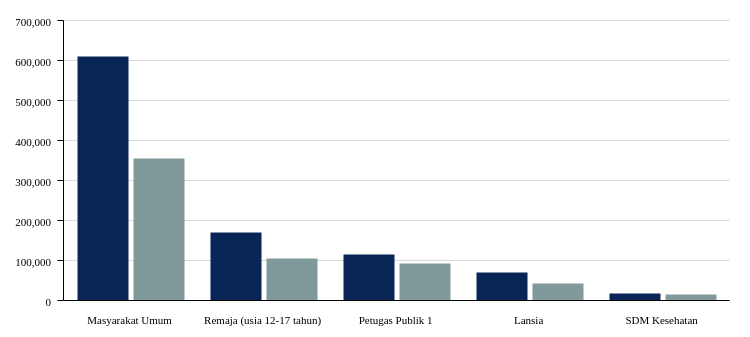 Berdasarkan kelompok sasaran, rincian vaksinasi untuk menangkal virus Covid-19 di provinsi ini yakni kelompok SDM kesehatan dengan target 14,26 ribu peserta. Pada dosis 1, berhasil dilakukan vaksinasi sebanyak 14,26 ribu jiwa (115,45 persen target) dan untuk vaksinasi dosis 2 telah tercapai 106,99 persen atau 15,25 ribu jiwa.