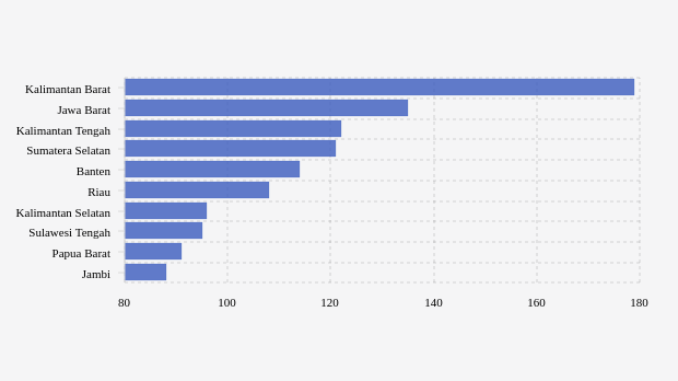 Di bawah Kalimantan Barat, ada Jawa Barat yang menempati posisi kedua terburuk di Indonesia dengan indeks kualitas udara 135. Kemudian, di posisi ketiga ada Kalimantan Tengah dengan indeks kualitas udara 122.