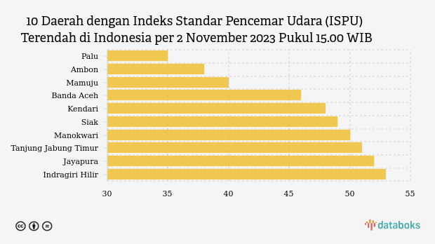 Berarti, pada Kamis (2/11/2023) pukul 15.00 WIB, kota dengan kualitas udara baik, yaitu Palu, Ambon, Mamuju, Banda Aceh, Kendari, Siak, dan Manokwari. Adapun, 3 kota lainnya, yakni Tanjung Jabung Timur, Jayapura, dan Indragiri Hilir memiliki kualitas udara sedang.