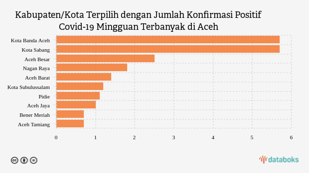 Sebaliknya untuk kota Sabang, data Kementerian Kesehatan memperlihatkan jumlah konfirmasi positif Covid-19 mingguan sebesar 5,7 jiwa per 100 ribu penduduk/minggu. Angka ini lebih tinggi dibandingkan pekan sebelumnya yang tidak dilaporkan adanya jumlah konfirmasi positif Covid-19 mingguan. Di urutan berikutnya Aceh Besar. Kota di provinsi Aceh ini mencatatkan jumlah konfirmasi positif Covid-19 mingguan sebesar 2,52 jiwa per 100 ribu penduduk/minggu