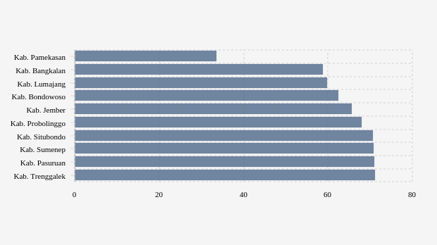 Menyusul berikutnya adalah kabupaten Bangkalan. Untuk vaksinasi dosis 2, daerah ini masuk nomor dua terendah. Dengan sasaran vaksin sebanyak 825,18 ribu peserta, namun telah berhasil direalisasikan 58,79 persen atau 485,1 ribu peserta.