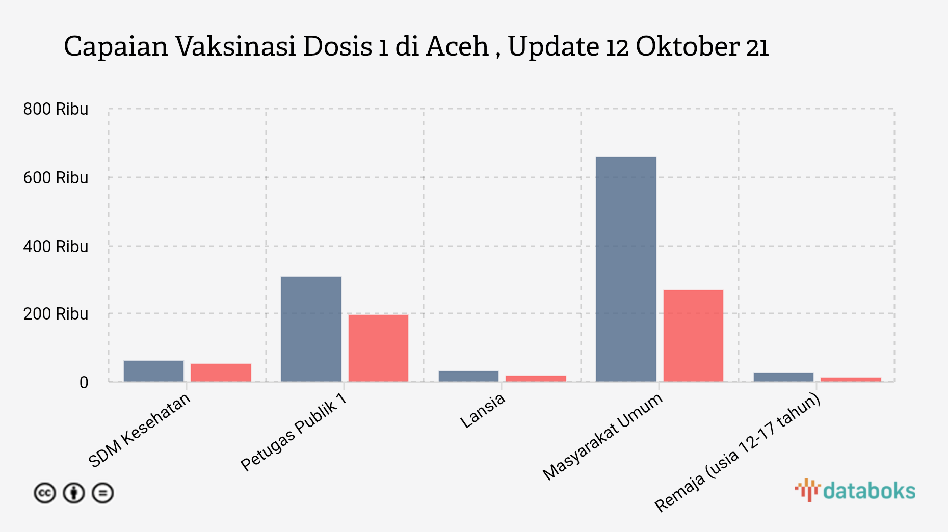 Cakupan vaksinasi dosis 1 di provinsi Aceh, hingga kemarin Selasa, 12 Oktober 2021, telah mencapai 27,06 persen. Angka ini setara dengan 1,09 juta peserta vaksin dari target yang ditetapkan sebanyak 4,03 juta orang. Sementara untuk vaksinasi dosis 2 hingga kemarin telah tercapai 13,77 persen dari target.