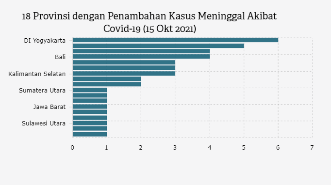Penambahan kasus meninggal karena terinfeksi virus corona terjadi di 18 provinsi. Provinsi yang mencatatkan penambahan kasus meninggal karena Covid-19 terbanyak hari ini adalah Daerah Yogyakarta, yaitu sebanyak 6 orang. Diikuti Jawa Timur ada 5 orang serta Jawa Tengah dan Bali masin-masing ada 4 orang.