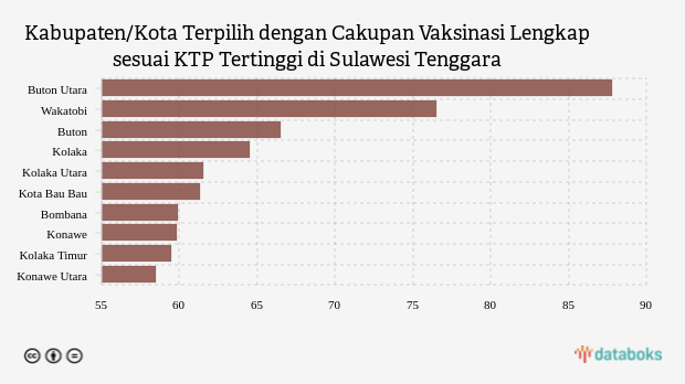 Urutan selanjutnya ditempati Wakatobi dan Buton yang masing-masing dengan catatan cakupan vaksinasi lengkap sesuai KTP sebesar 76,52 persen dan 66,46 persen