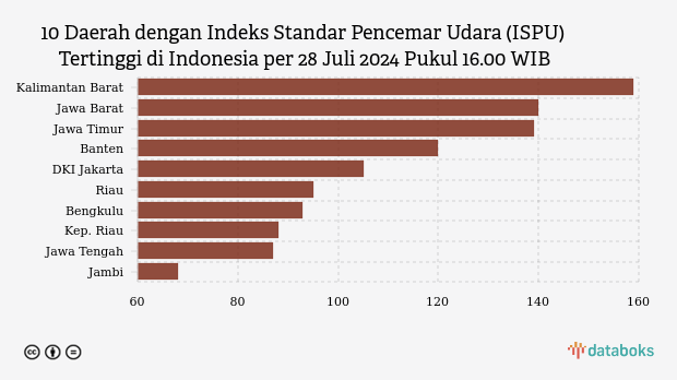 Berikut daftar 10 provinsi dengan indeks kualitas udara terburuk di Indonesia pada Minggu, 28 Juli 2024 pukul 16.00 WIB.