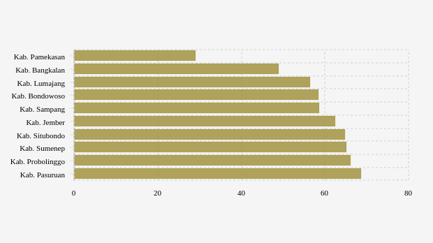 Menyusul berikutnya adalah kabupaten Bangkalan. Untuk vaksinasi dosis 2, daerah ini masuk nomor dua terendah. Dengan sasaran vaksin sebanyak 825,18 ribu peserta, namun baru direalisasikan 48,95 persen atau 403,92 ribu peserta.
