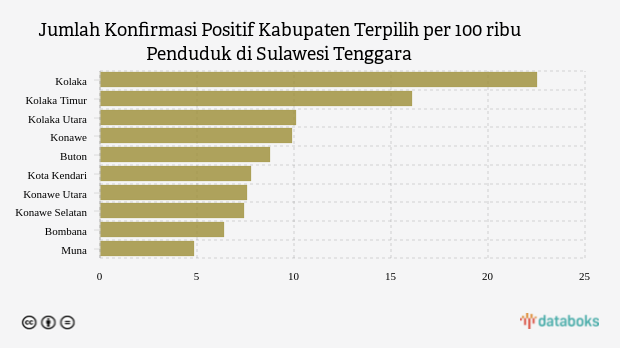 Jumlah penambahan konfirmasi positif Covid-19 di Sulawesi Tenggara saat ini paling tinggi terjadi di Kolaka dengan jumlah 22,51 kasus per 100 ribu penduduk per minggu pada Senin, 14 Maret 2022. Angka ini selisih enam kasus dibandingkan catatan kasus di wilayah lain yang berada di urutan kedua.