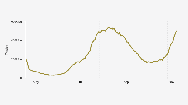 Kasus aktif Covid-19 di Indonesia hari ini naik. Berdasarkan laporan Satgas Penanganan Covid-19, jumlah kasus aktif Covid-19 di Indonesia kini ada 49.794 kasus aktif per Minggu, 13 November 2022.