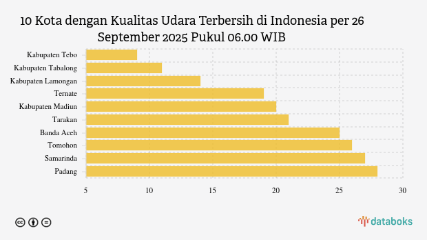 Berikut daftar lengkap 10 kota dengan kualitas udara paling bersih di Indonesia menurut KLHK pada Jumat, 26 September 2025 pukul 06.00 WIB.