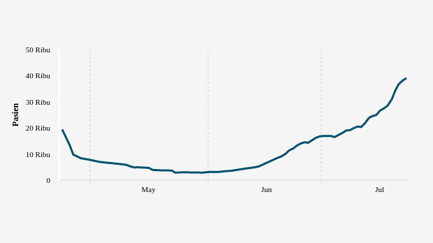 Kasus aktif Covid-19 di Indonesia saat ini kembali mulai naik. Berdasarkan laporan Satgas Penanganan Covid-19, jumlah kasus aktif Covid-19 di Indonesia kini ada 39.065 kasus aktif per Sabtu, 23 Juli 2022.