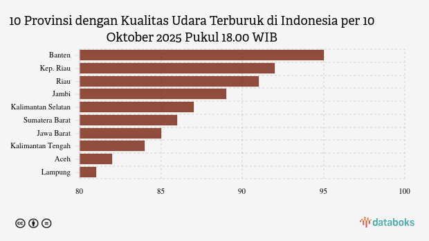 Berikut daftar 10 provinsi dengan indeks kualitas udara terburuk di Indonesia pada Jumat, 10 Oktober 2025 pukul 18.00 WIB.