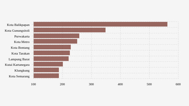 Urutan lima teratas dimulai dari yang terbesar adalah kota Balikpapan, kota Gunungsitoli, Purwakarta, kota Metro dan kota Bontang dengan masing-masing rasio 562,11 persen, 348,3 persen, 258,39 persen, 250,29 persen dan 228,02 persen.