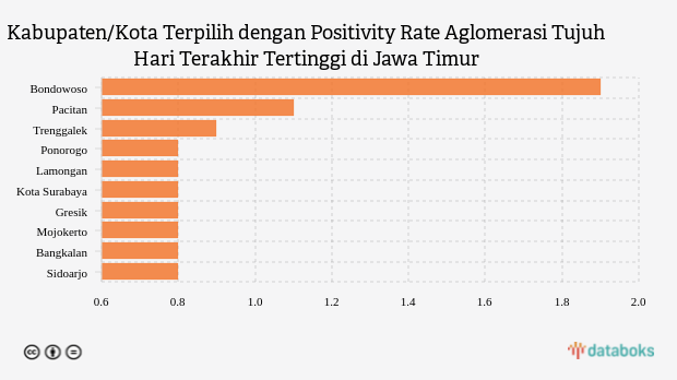 Bondowoso adalah kabupaten di urutan pertama dengan positivity rate aglomerasi tujuh hari terakhir tertinggi sebesar 1,88 persen. Kondisi positivity rate aglomerasi tujuh hari terakhir di kabupaten ini terlihat belum membaik karena terjadi peningkatan dibandingkan pekan sebelumnya yang tercatat 0,84 persen.