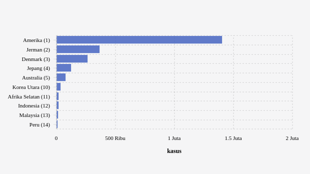 Selanjutnya, jumlah kasus Omicron di Denmark naik 1,36 persen menjadi 261,89 ribu kasus dibandingkan pekan sebelumnya, Jepang dengan jumlah kasus Omicron 124,81 ribu kasus (naik 1,07%) dan jumlah kasus Omicron di Australia naik 2,67 persen menjadi 78.110 kasus dibandingkan pekan sebelumnya