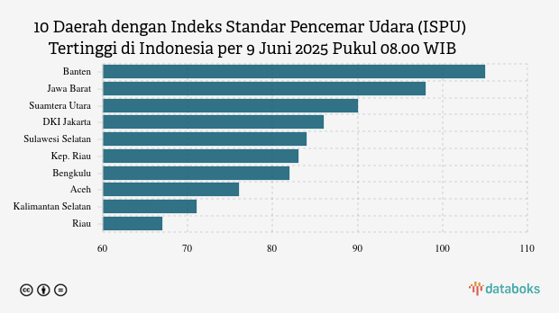 Berikut daftar 10 provinsi dengan indeks kualitas udara terburuk di Indonesia pada Senin, 9 Juni 2025 pukul 08.00 WIB.