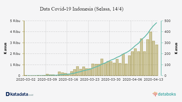 Tren kasus pandemi Covid-19 di tanah air terus menanjak. Juru bicara pemerintah untuk penanganan Covid-19 Achmad Yurianto mengumumkan hingga Selasa (14/4), terdapat 4.839 kasus atau bertambah 282 dari sehari sebelumnya.